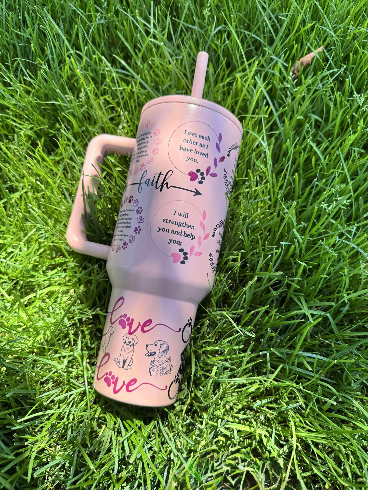 Available in various sizes, this 40 oz stainless steel tumblers with handle features joyful designs, uplifting verses, and vibrant colors—perfect for gifting or sipping something warm in grace-filled peace.