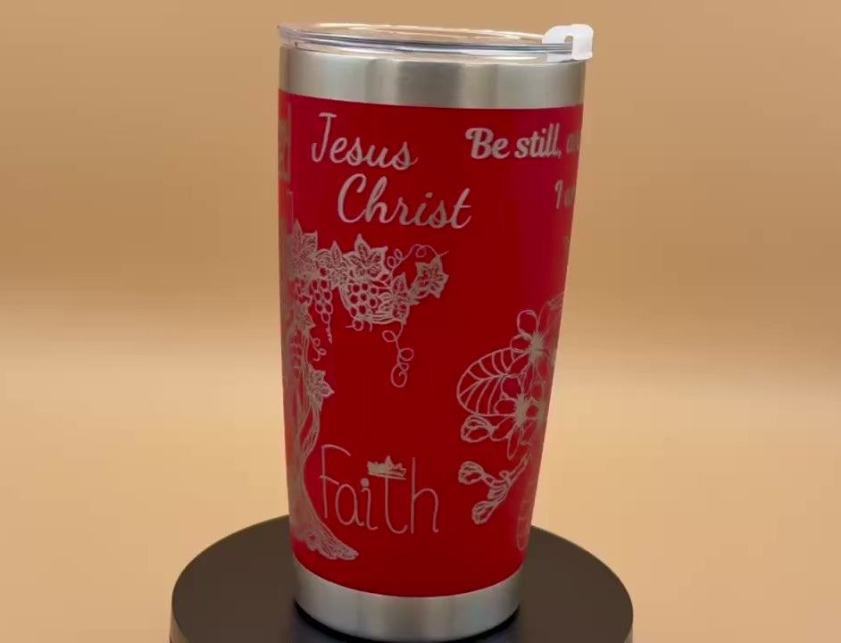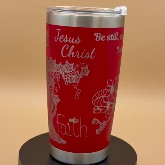 This 20 oz stainless steel tumbler features original hand-drawn artwork engraved onto a bright red powder-coated finish. The wraparound design includes floral artwork paired with the powerful scripture “Be still, and know that I am God” from Psalm 46:10.