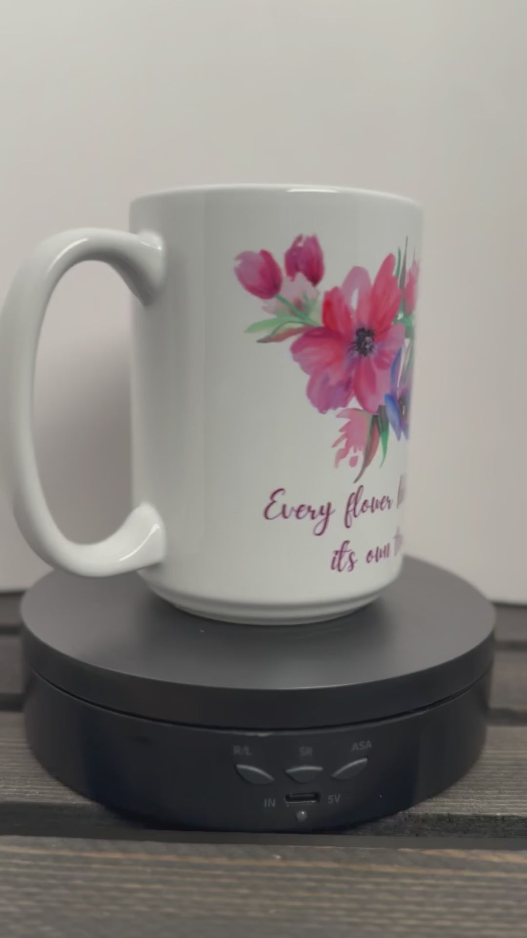 Gentle, blooming encouragement—this 15 oz ceramic mug features a soft watercolor bouquet and the uplifting reminder: “Every flower blooms in its own time.”